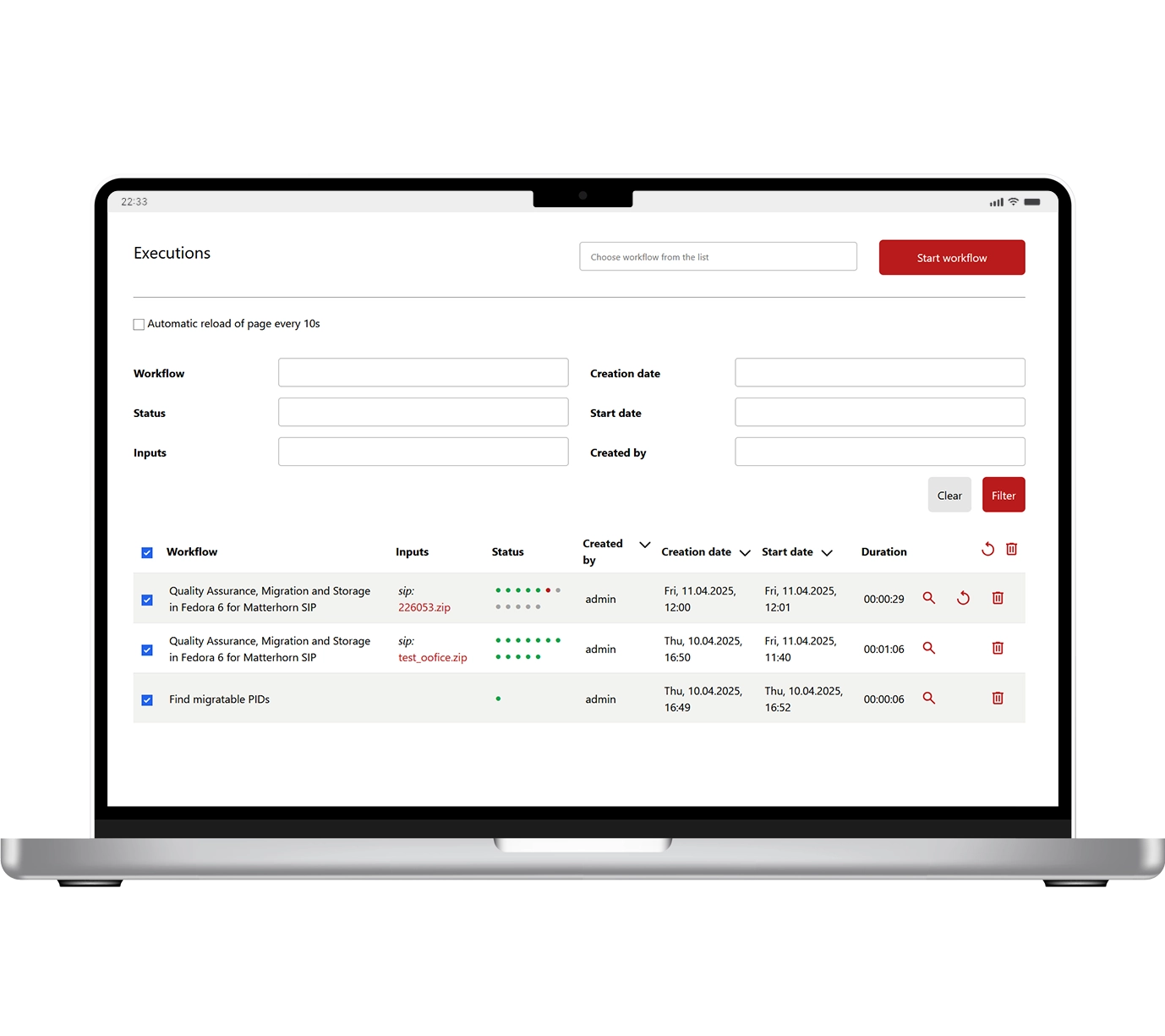 Wir garantieren Ihnen, dass wir digitale Archivierung basierend auf dem international etablierten Standard (OAIS) betreiben. Essenzieller Bestandteil von OAIS ist das so genannte «Preservation Planning». Daten und Metadaten werden im Archivspeicher periodisch überprüft und bei Bedarf und in Absprache mit dem Kunden auf neue Archivformate migriert. Digitale Archivierung ist ein kontinuierlicher Prozess und nach der Verschiebung in den Archivspeicher nicht abgeschlossen.